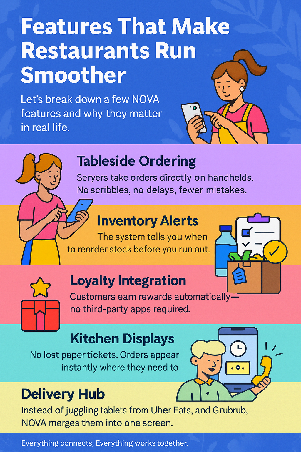 That’s where NOVA comes in. It’s not just another POS—it’s an all-in-one restaurant POS and management platform designed to simplify your operations and eliminate the headaches caused by disconnected tools.