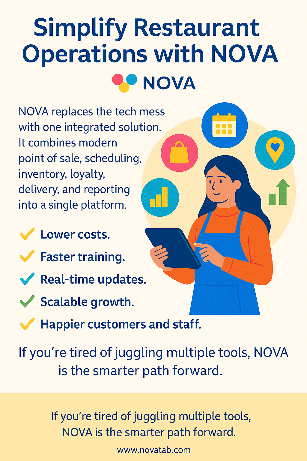 If you’re tired of managing a patchwork of apps and devices, NOVA is your solution. It brings everything—POS, scheduling, inventory, loyalty, delivery, and analytics—into one platform.